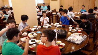 朝食タイムです。メニューは、パン、野菜のミルクスープ、ウィンナーと野菜のソテー、バナナ、紅茶です。昨日の夜のレクでバドミントンの運動を行ったので、麻布小の児童はたくさんおかわりをしています。今日は課題別行動なので英気を養ってがんばりましょう!!