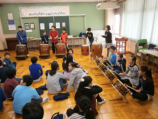 6年生全員で光庭にて、鼓笛の演奏で迎えました。